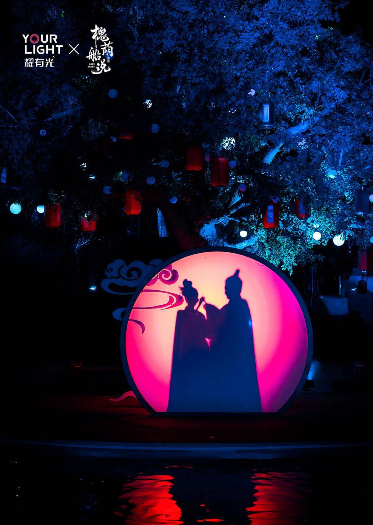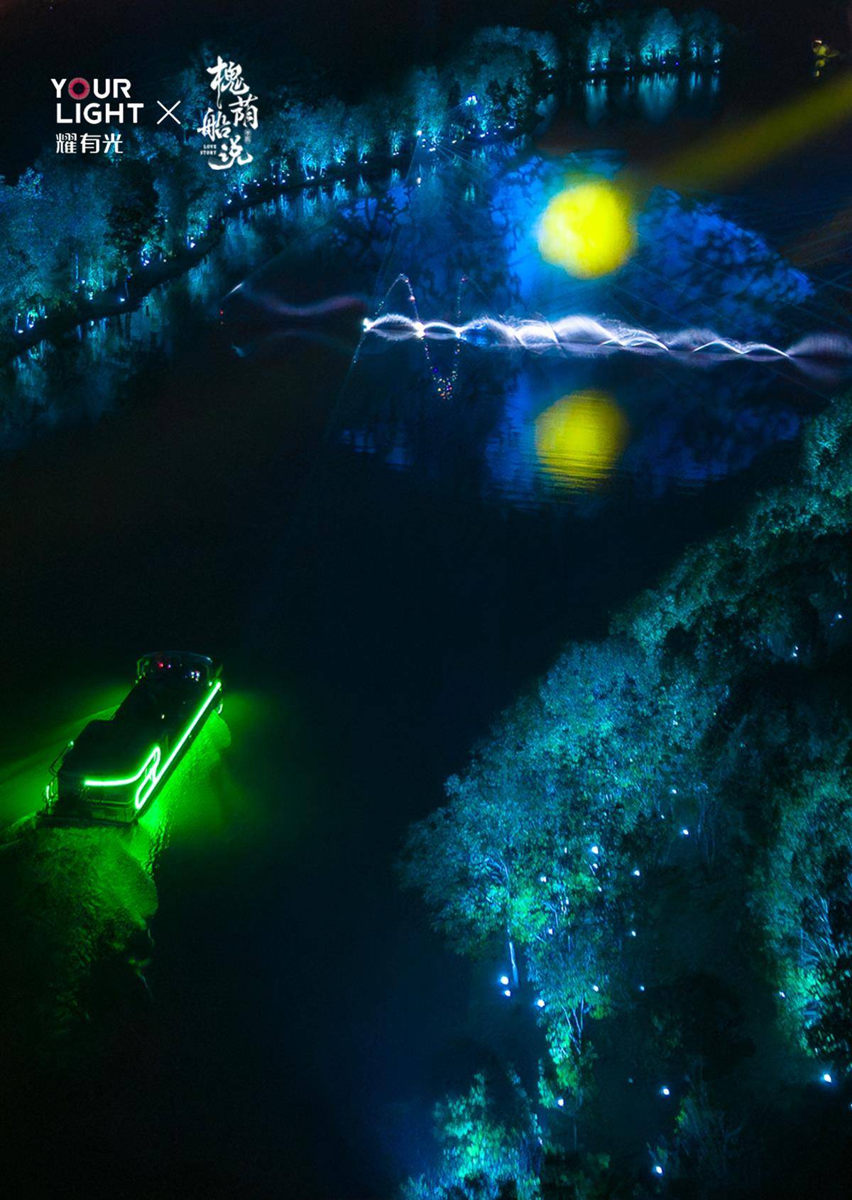 大型行浸式水上夜游演出《槐荫船说》以六大篇章层层递进,360°环绕观演体验,让观众化身见证者,与七仙女共渡银河。
