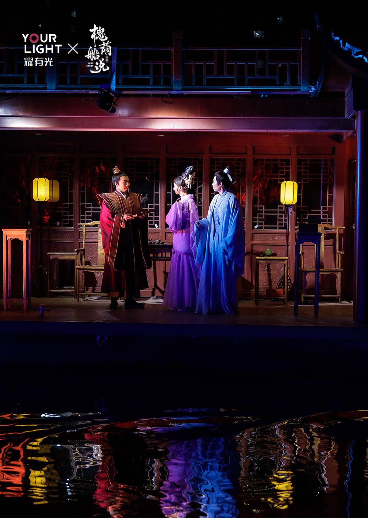 《槐荫船说》首创“水上行浸式观演”模式,轻舟载客,景随船移,星空水幕构筑立体剧场。